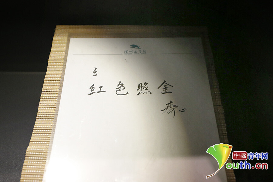 展馆二层展出的由习仲勋夫人齐心为照金题写的“红色照金”原件。其中“红”字上方为齐心初次下笔的痕迹,因感到不满意遂在下方重写。过程中为了节约,齐心并未更换题字纸张。中国青年网记者 李拓 摄