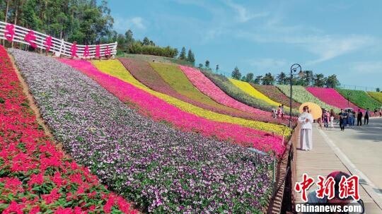 在福建漳州长泰县的十里蓝山景区,520米长的彩虹花海,种着三色堇、薰衣草、鼠尾草、金鱼草等十余中常见草花,不同种类、不同颜色的草花错落分布,吸引着游客驻足。 闫旭 摄