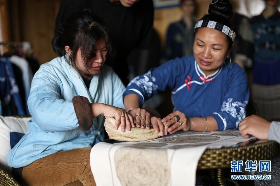 5月2日,在贵州省丹寨县扬武镇排莫村“明秀蜡染坊”展览室,张世秀(右)教授一名艺术家使用传统工具熨平蜡染布。