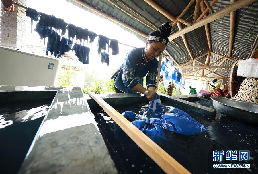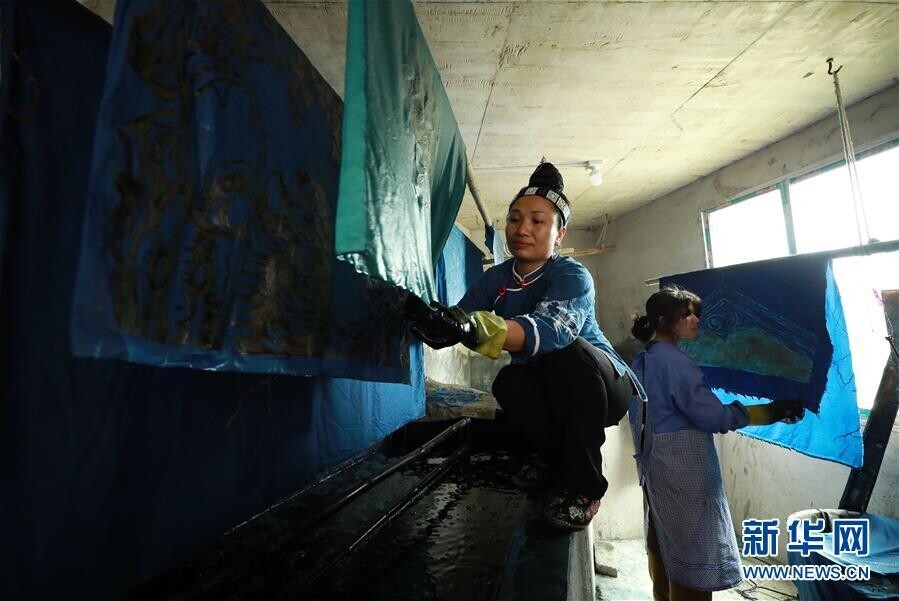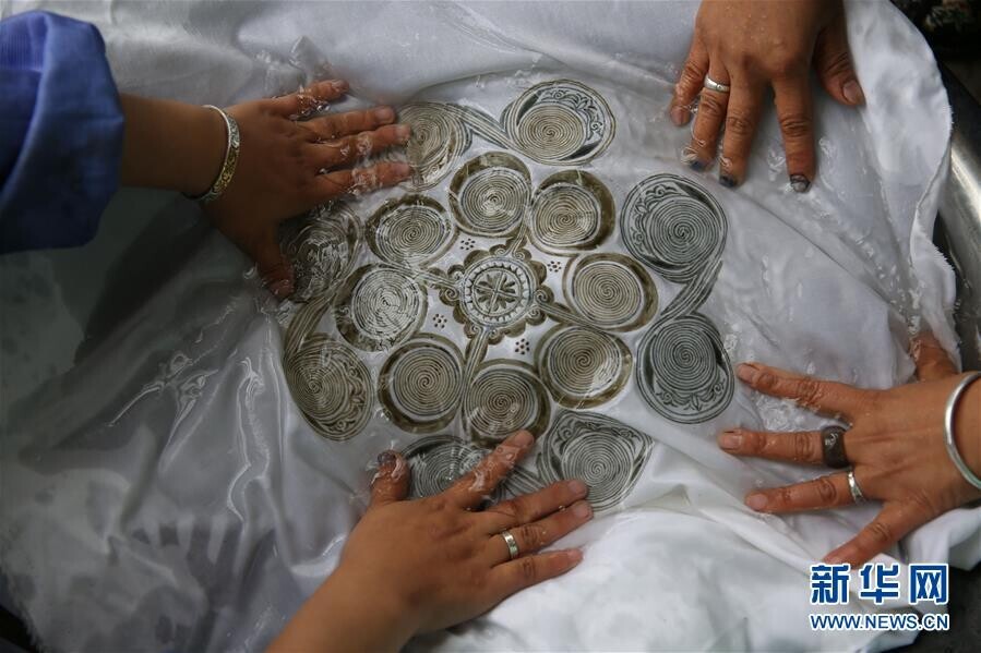 5月2日,在贵州省丹寨县扬武镇排莫村“明秀蜡染坊”,张世秀把脱蜡后的艺术作品进行清洗。