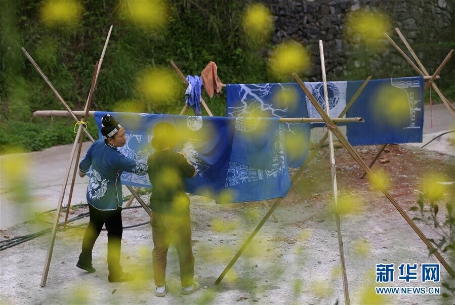 5月2日,在贵州省丹寨县扬武镇排莫村,张世秀(左)和艺术家们一起晾晒蜡染艺术作品。