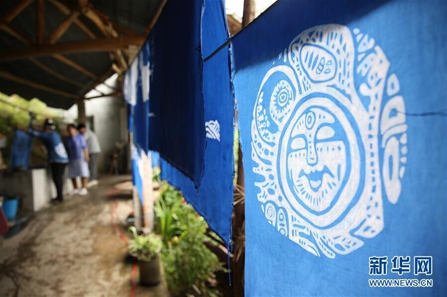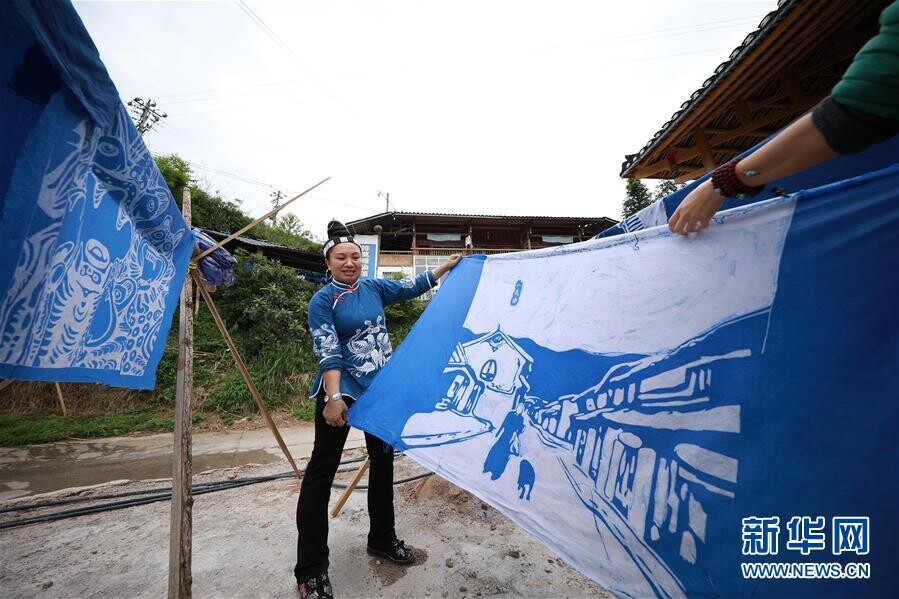 5月2日,在贵州省丹寨县扬武镇排莫村,张世秀和艺术家们一起晾晒蜡染艺术作品。