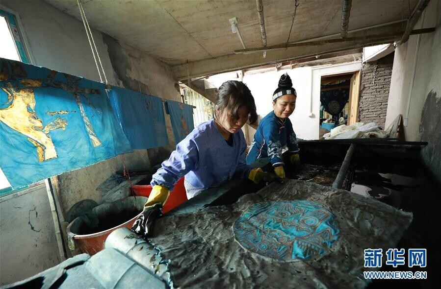 5月2日,在贵州省丹寨县扬武镇排莫村”明秀蜡染坊“染布室,张世秀(左)和艺术家一起把画好的艺术作品晾水。