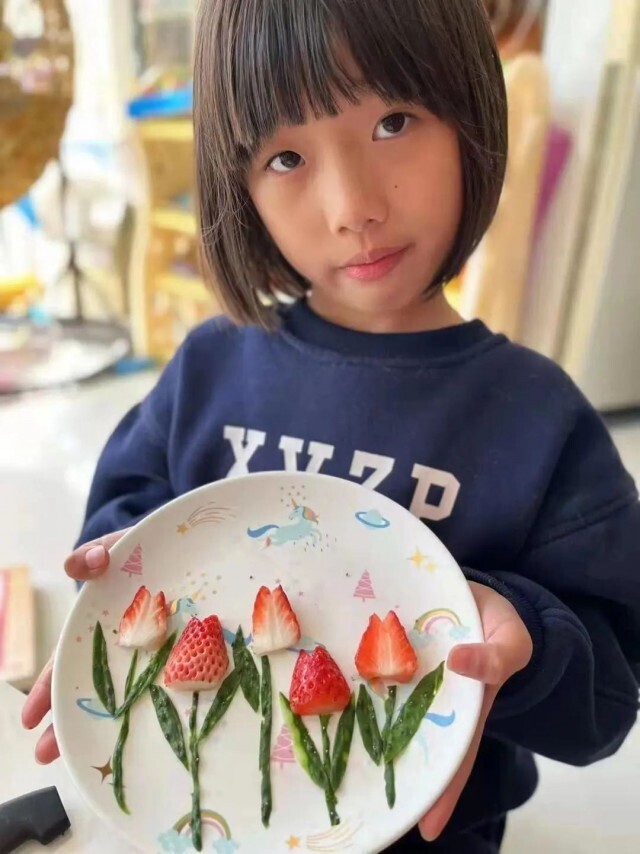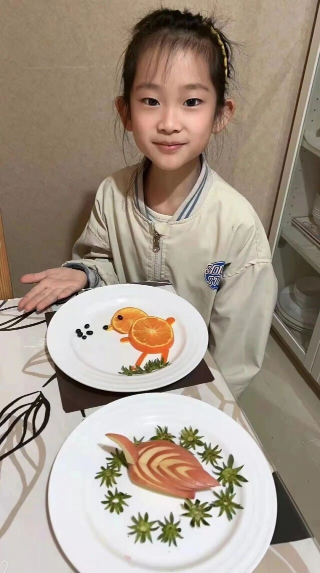 黑芝麻胡同小学学生展示和家长一起制作的水果拼盘