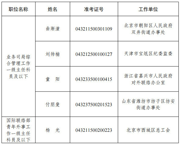 根据2023年度中央机关公开遴选和公开选调公务员工作有关要求,经笔试、面试、体检和考察等程序,研究确定曲渐潼等5名同志为共青团中央2023年度公开遴选拟任职人员(名单附后),现进行公示,公示期为5个工作日。公示期间,如有异议,请向共青团中央组织部反映。