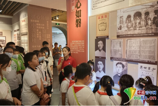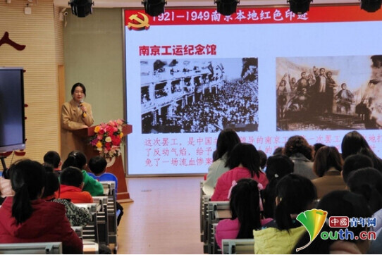大学生志愿者给小学生讲述南京本地的红色故事。
