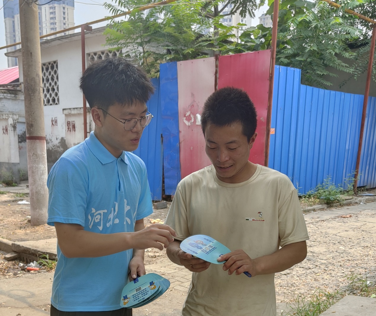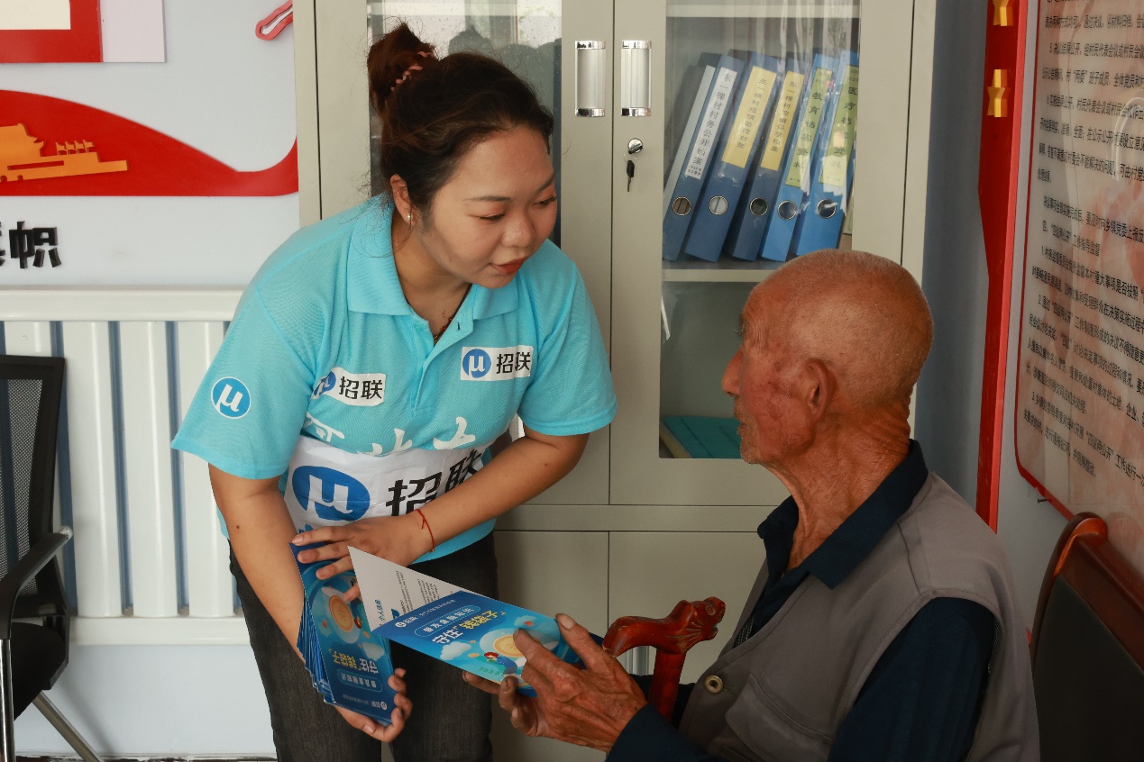 图为队员向村民发放招联提供的金融明白人消保宣传扇子、守住钱袋子、防网络诈骗、防电信诈骗等折页宣传物料,提高村民反诈能力。中国青年网通讯员 李博宇 摄