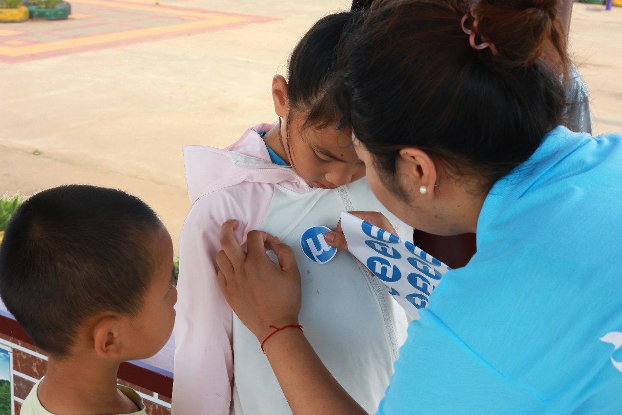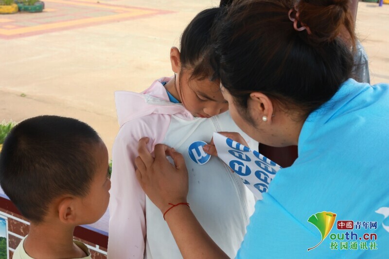 图为队员为村里的小朋友贴招联贴纸,分发礼品。中国青年网通讯员 王元元 摄