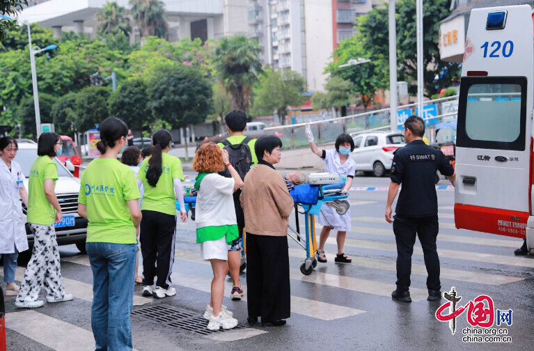 “请不要围在现场,保持现场距离!”来自川北医学院的队员们在队长赵阳的带领下,迅速反应,及时拨打急救电话,并主动疏散周围群众,维持现场秩序,安抚家属情绪,为紧急救护提供有利环境。18分钟后,“120”急救人员赶到现场“接力”,此时患者已恢复微弱脉搏。急救人员询问患者家属,得知患者有“慢性阻塞性肺气肿”等病史,随后,立即建立静脉通道,使用简易呼吸器辅助通气,并且持续进行心肺复苏和人工呼吸。义诊团队的及时处理,为患者争取了宝贵的救治时间,赢得了“黄金四分钟”,该患者随即被送往医院。