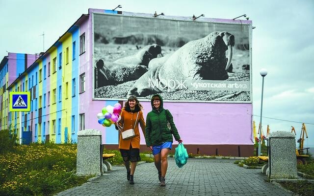 【环球时报综合报道】虽然阿纳德尔位置偏远、气候恶劣,但它称得上俄罗斯最艳丽的城市之一。这里几乎每栋房子的墙上都有壁画,看,这栋房子的墙上有一群充满好奇心的海豹正在注视路人,另一栋墙上有只巨大的鹿在顽皮地眨着眼睛……市内街道蜿蜒曲折,既有现代化电影院和体育俱乐部,也有各种标着北极动物形象的儿童游乐场。