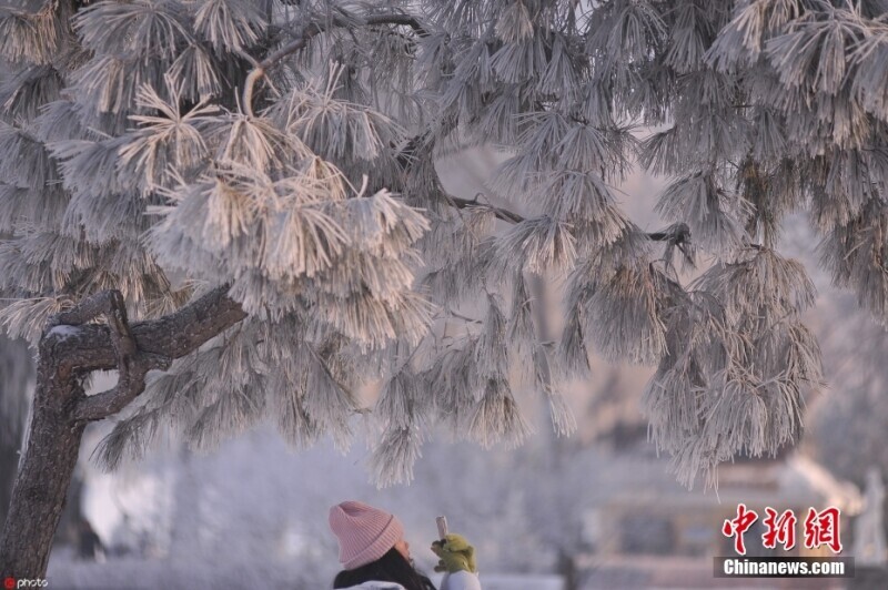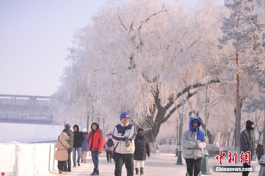 1月13日上午,哈尔滨市松花江畔出现美丽的雾凇景观,一排排白色树挂如同千树万树梨花盛开,仿佛进入童话世界。