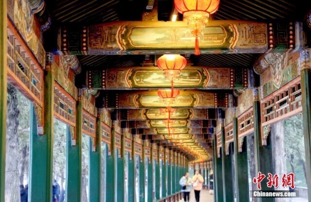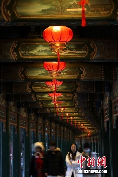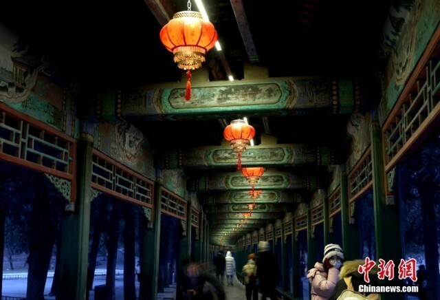1月17日,北京颐和园长廊点亮宫灯,营造出喜庆的节日氛围。