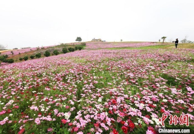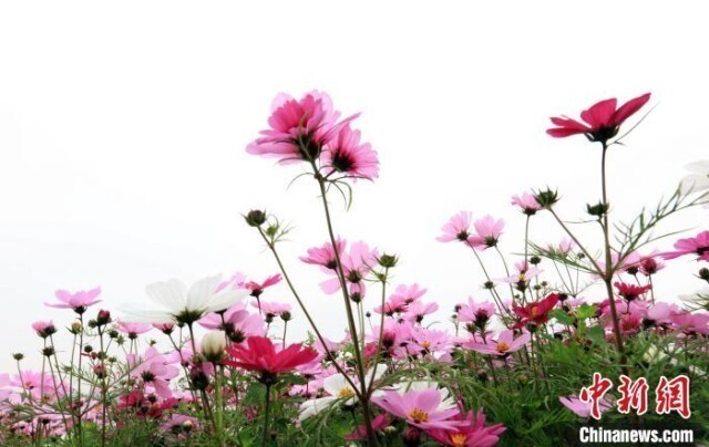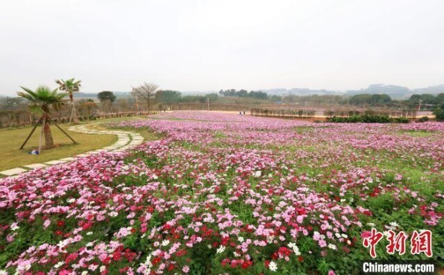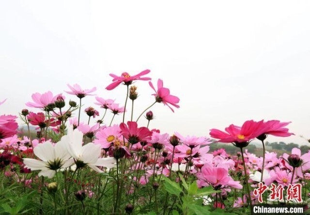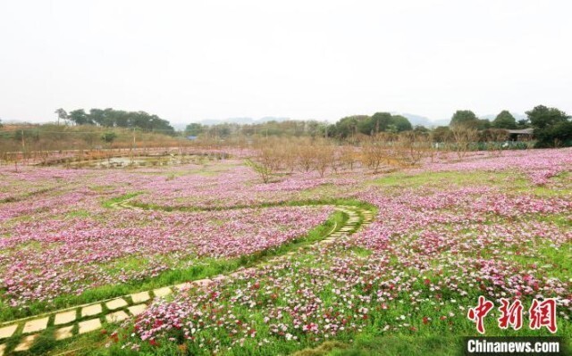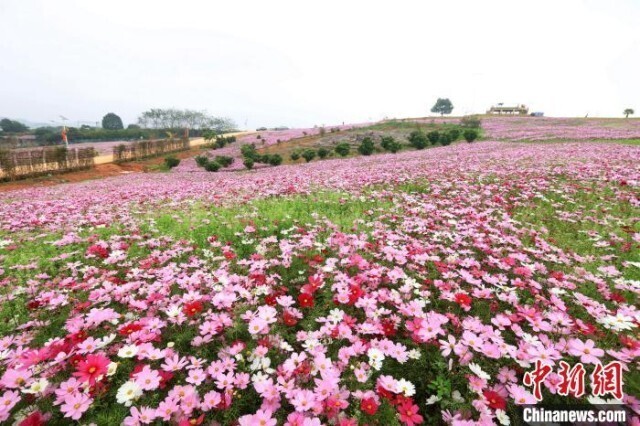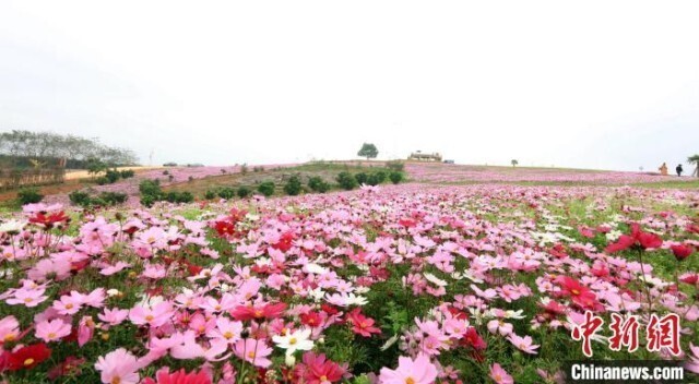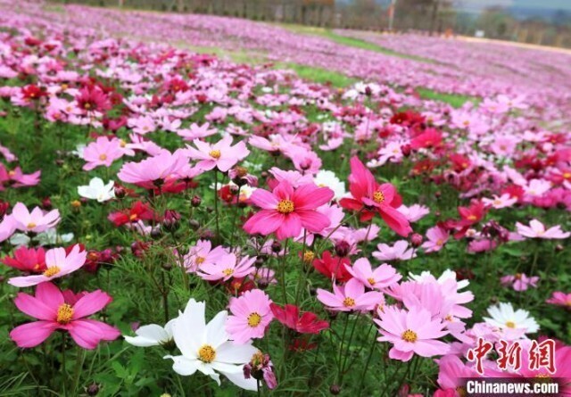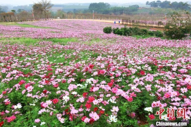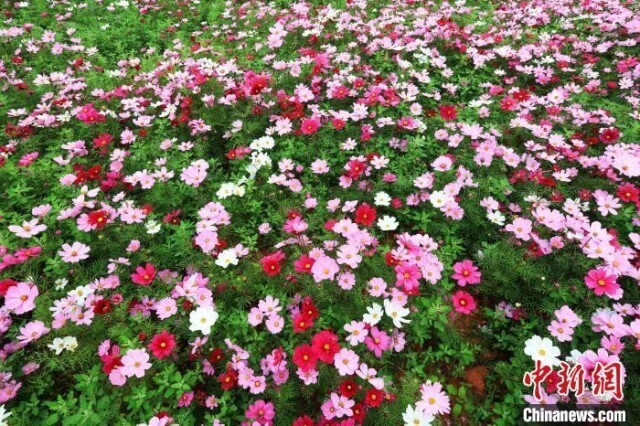 近日,在位于广西南宁明阳工业园区内的台湾花卉产业园,格桑花进入盛花期,成片的花海美如画卷。