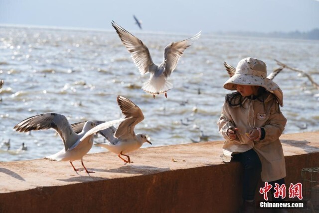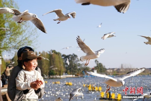 3月4日,云南昆明,小女孩在滇池边喂红嘴鸥。随着天气回暖,越冬的红嘴鸥将陆续飞回栖息地,众多市民和游客来到滇池边与红嘴鸥互动。