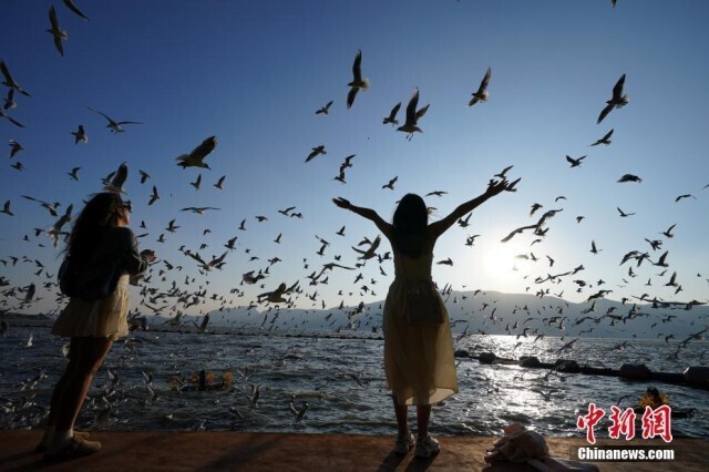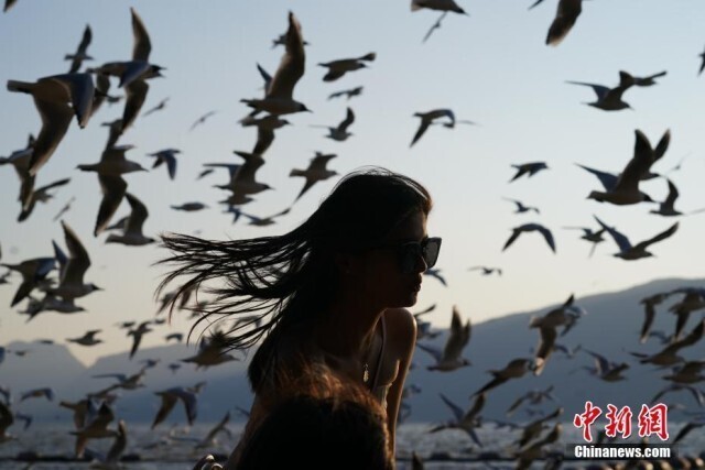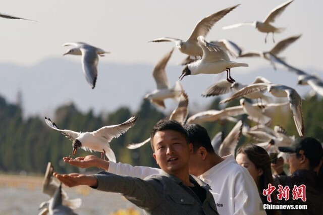 3月4日,云南昆明,游客在滇池与红嘴鸥合影。随着天气回暖,越冬的红嘴鸥将陆续飞回栖息地,众多市民和游客来到滇池边与红嘴鸥互动。