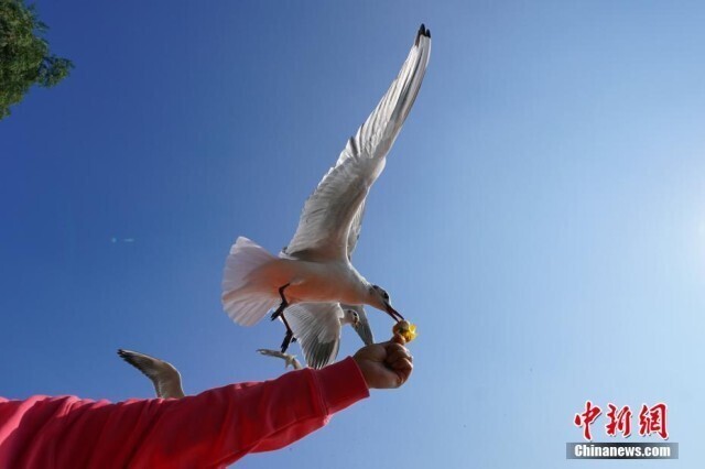 3月4日,云南昆明,红嘴鸥从游客手中取食。随着天气回暖,越冬的红嘴鸥将陆续飞回栖息地,众多市民和游客来到滇池边与红嘴鸥互动。