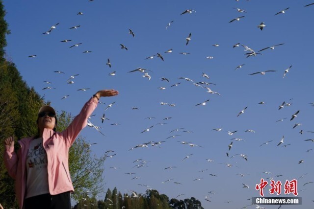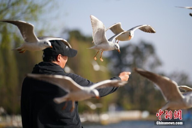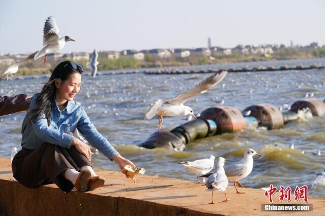 3月4日,云南昆明,市民在滇池边喂红嘴鸥。随着天气回暖,越冬的红嘴鸥将陆续飞回栖息地,众多市民和游客来到滇池边与红嘴鸥互动。