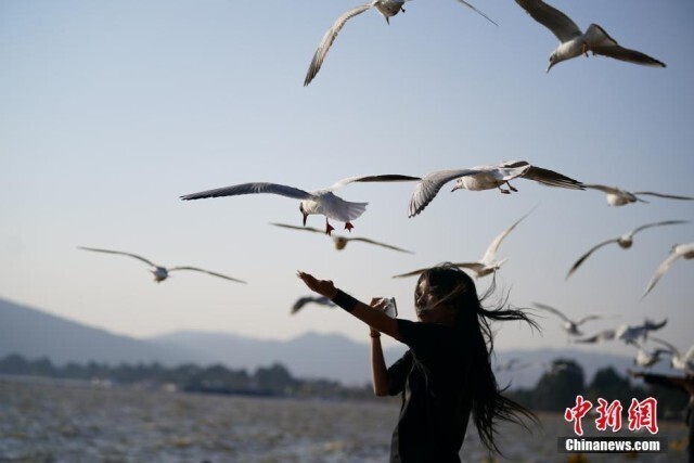 3月4日,云南昆明,一名女孩在滇池边与红嘴鸥合影。随着天气回暖,越冬的红嘴鸥将陆续飞回栖息地,众多市民和游客来到滇池边与红嘴鸥互动。