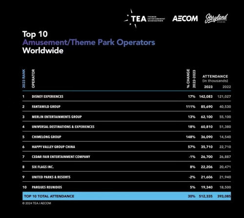 作为自2019年以来该榜单的首次重新排名,TEA和AECOM在报告中指出,随着疫情退去,全球景点行业稳定前行,迈向未来,各个地区的游客量已经全部接近或超过了2019年水平。2023年全球前十大主题乐园的年游客接待量总体同比大幅增长30%,达到5.12亿人次,与2019年5.21亿人次几乎持平。