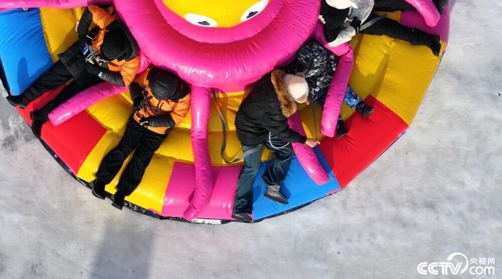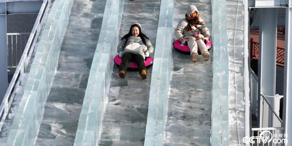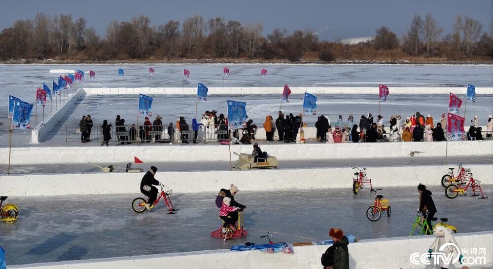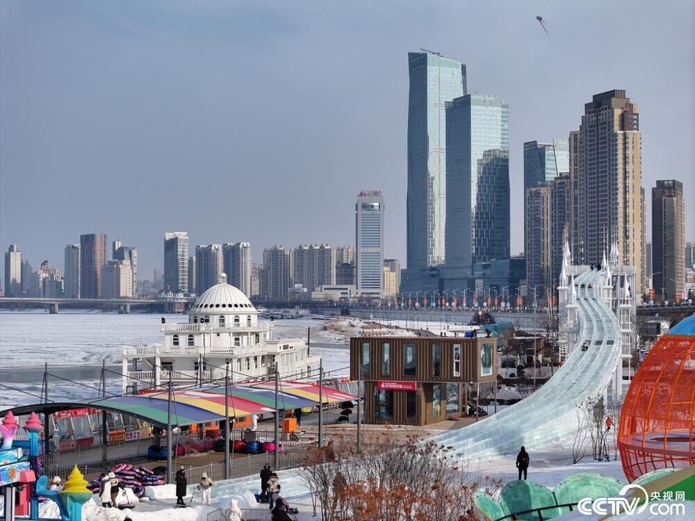 2024年12月25日,黑龙江省哈尔滨市,松花江畔,一处冬季大型冰雪乐园已经营业,各地游人在冰天雪地间体验冰上自行车、冰滑梯、冰上飘移、冰上坦克等游乐项目,松花江成了欢乐的海洋。视觉中国