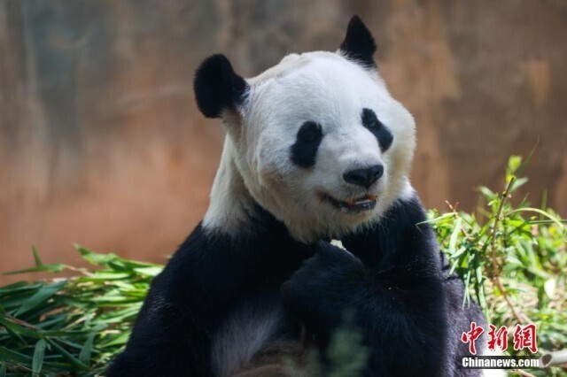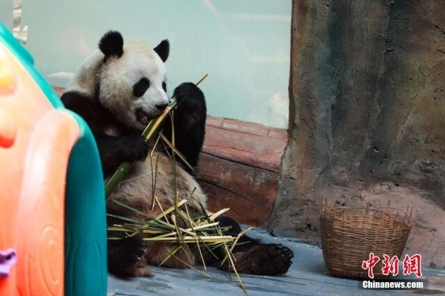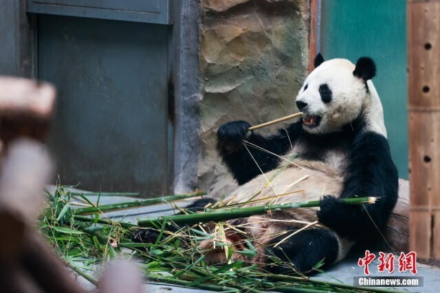 6月10日,青海西宁熊猫馆内,大熊猫惬意享受着高原独特的凉爽夏日。西宁熊猫馆是目前中国国内最大的单体熊猫馆,有一雄三雌4只大熊猫居住于此。图为大熊猫“和兴”吃竹子。