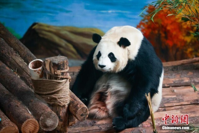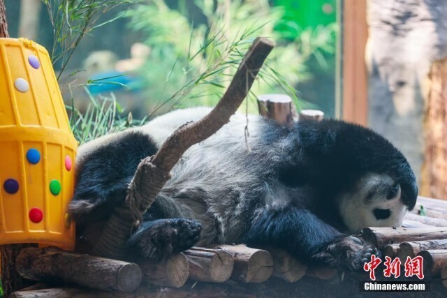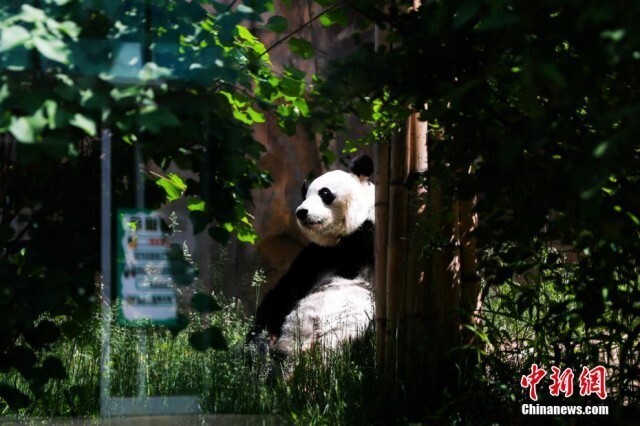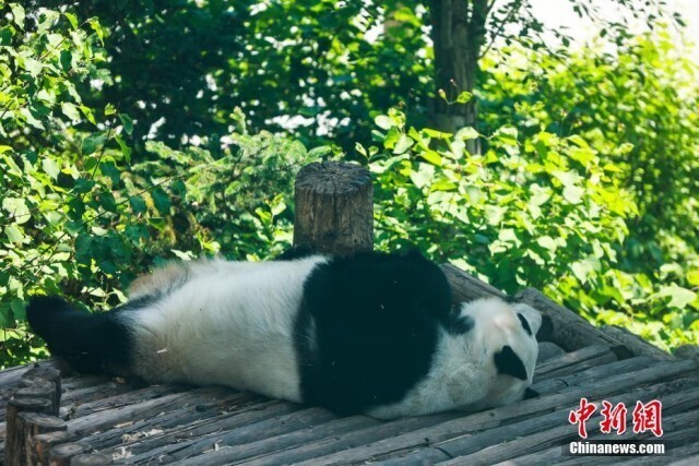 6月10日,青海西宁熊猫馆内,大熊猫惬意享受着高原独特的凉爽夏日。西宁熊猫馆是目前中国国内最大的单体熊猫馆,有一雄三雌4只大熊猫居住于此。图为大熊猫“圆满”悠闲中。