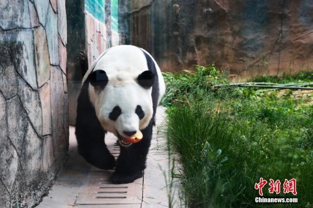 6月10日,青海西宁熊猫馆内,大熊猫惬意享受着高原独特的凉爽夏日。西宁熊猫馆是目前中国国内最大的单体熊猫馆,有一雄三雌4只大熊猫居住于此。图为大熊猫“双欣”吃苹果。