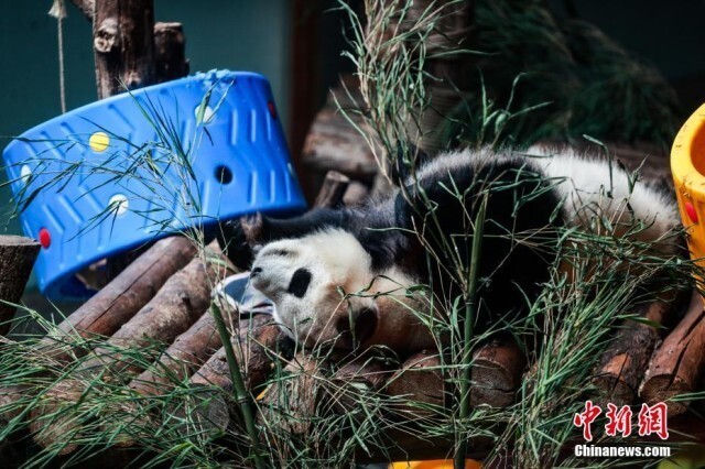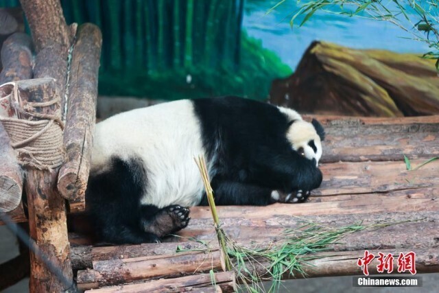 6月10日,青海西宁熊猫馆内,大熊猫惬意享受着高原独特的凉爽夏日。西宁熊猫馆是目前中国国内最大的单体熊猫馆,有一雄三雌4只大熊猫居住于此。图为大熊猫“双欣”酣睡中。