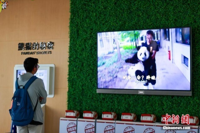 6月10日,青海西宁熊猫馆内,大熊猫惬意享受着高原独特的凉爽夏日。西宁熊猫馆是目前中国国内最大的单体熊猫馆,有一雄三雌4只大熊猫居住于此。图为游客在熊猫馆观看大熊猫科普短片。