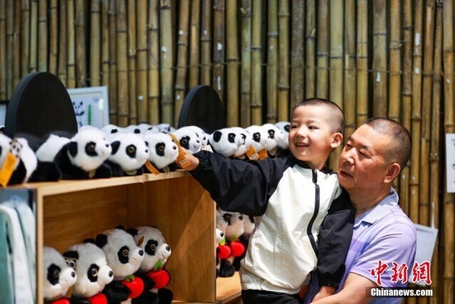 6月10日,青海西宁熊猫馆内,大熊猫惬意享受着高原独特的凉爽夏日。西宁熊猫馆是目前中国国内最大的单体熊猫馆,有一雄三雌4只大熊猫居住于此。图为小朋友挑选大熊猫玩偶。