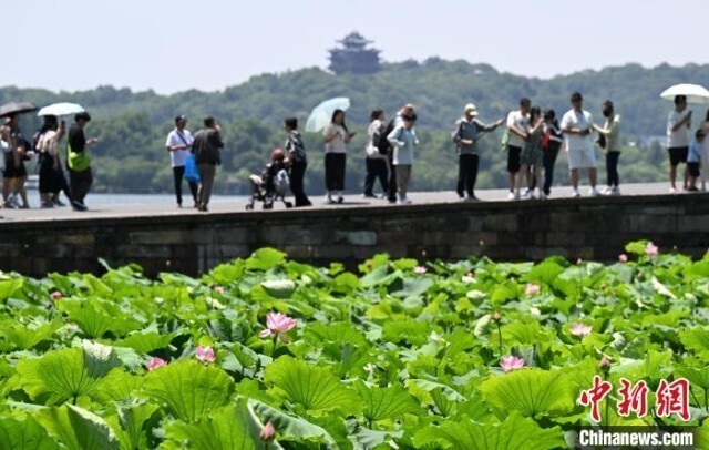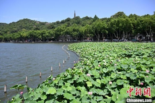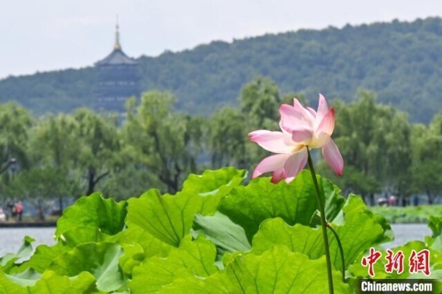 6月16日,雷峰塔、白堤前荷花盛开。近日,浙江杭州西湖多个水域荷花初放,“接天莲叶无穷碧,映日荷花别样红”的夏日美景逐步上线。中新社记者 王刚 摄