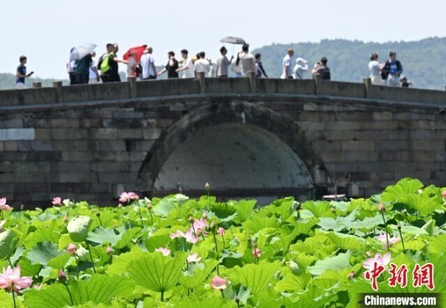 6月16日,断桥前不少荷花开放。近日,浙江杭州西湖多个水域荷花初放,“接天莲叶无穷碧,映日荷花别样红”的夏日美景逐步上线。中新社记者 王刚 摄