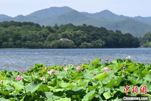 6月16日,西湖荷区的荷花开放。近日,浙江杭州西湖多个水域荷花初放,“接天莲叶无穷碧,映日荷花别样红”的夏日美景逐步上线。中新社记者 王刚 摄