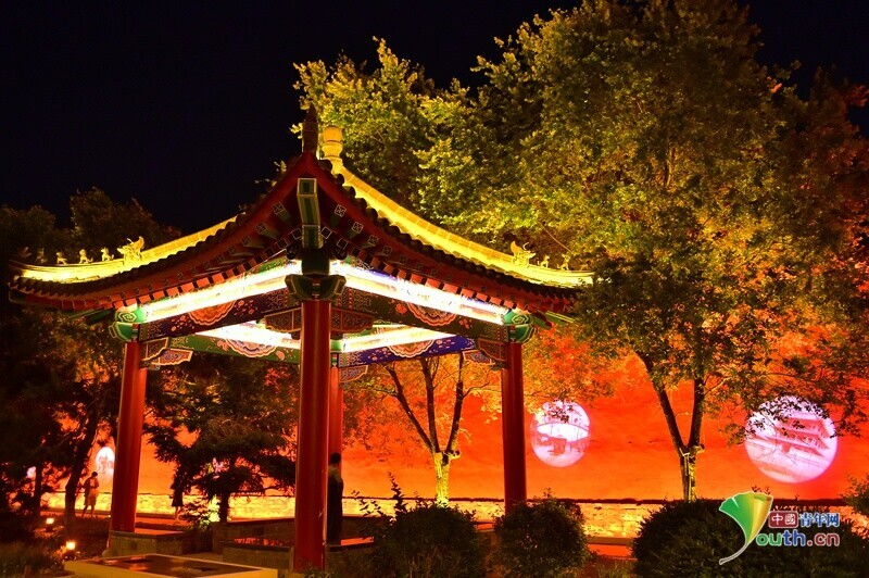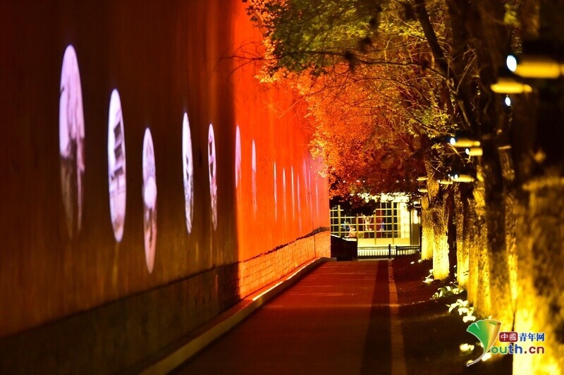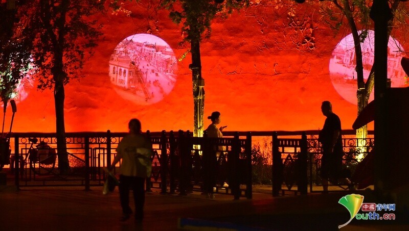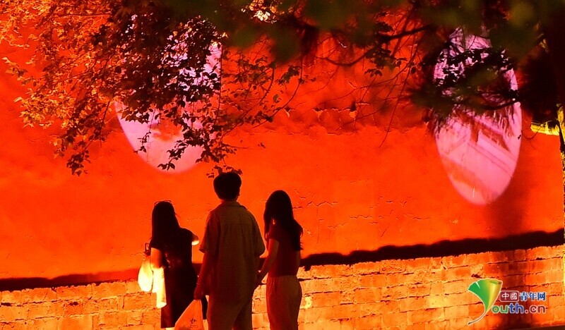 2025年6月16日,辽宁省沈阳市,沈阳故宫夜晚红墙灯光秀映出老建筑群夜间景观,市民穿行漫步在沈阳故宫红墙下观赏景观拍照留念。