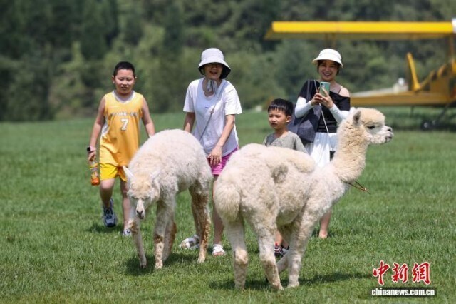 7月31日,两只羊驼吸引游客。中新社记者 瞿宏伦 摄