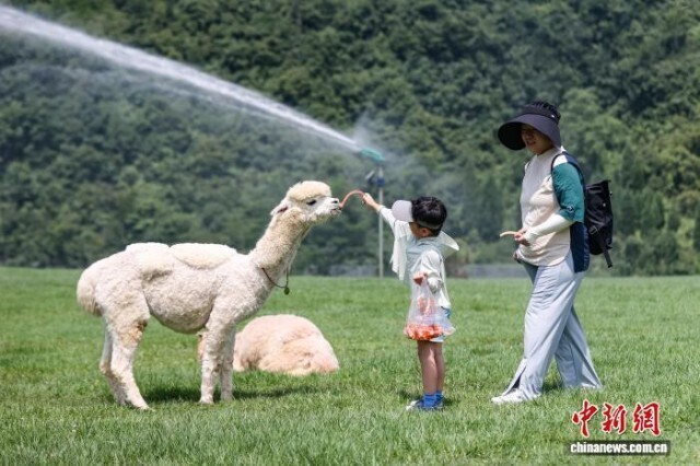 7月31日,游客在给羊驼喂食。中新社记者 瞿宏伦 摄