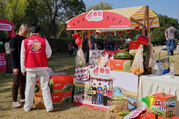 提炼本地文化转化有鲜明辨识度的地域品牌,也是许多团队的项目方向。市集上,两处“西瓜”主题项目同样人气爆棚。杭州师范大学团队的“春怡贡瓜”展台前,卡通IP“瓜小贡”憨态可掬,印着“明嘉靖贡瓜”纹样的礼盒让普通平湖西瓜变身“文化伴手礼”;在浙江建设职业技术学院的友联西瓜文化馆体验区,产品展销区、西瓜科普墙、打卡体验角将“卖西瓜”升级为“品瓜文化、享农趣”的沉浸式体验。这些项目助力了平湖市西瓜产业的提档升级。