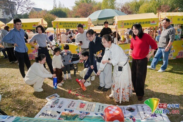 11月30日,集创意文创、非遗展演、互动体验于一体的闭幕式暨青春市集举行。绍兴文理学院的“杉青江湖令”剧本杀展位吸引亲子家庭参与剧情,在“菌菇基地智斗”环节学习种植知识,间接带动周边菌菇农户销售;宁波城市职业技术学院的“桥你欢心”文创展位,印有浙派民居元素的徽章、明信片、小镜子等成为热门伴手礼……每位游客都能直观感受“产业赋能乡村”的民生温度。
