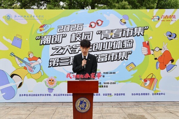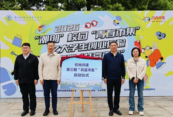 4月21日,浙江财经大学东方学院2026年“潮创”校园“青春市集”之大学生创业体验第三期“共富市集”启幕。本次活动以“潮创赋能、校地共富”为核心,旨在融合校地资源,搭建大学生创新创业实践平台,推动青年创意与地方发展同频共振,助力校地融合共富走深走实。学院党委副书记汪风易、副院长张书铭,海宁市长安镇党委副书记潘晓国、党委委员张薪薪,以及校地相关部门负责人、师生代表出席启幕仪式。