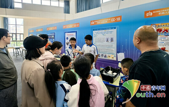 在机器人创意赛展览区,南华县民族中学学生何罗俊毅、窦润阳为观众讲解并展示他们的参赛作品。东南大学研支团供图