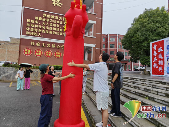 贵州省贞丰县第二中学开启新生入学工作。图为研支团成员在校园设置迎新拱门。宋钱丽供图