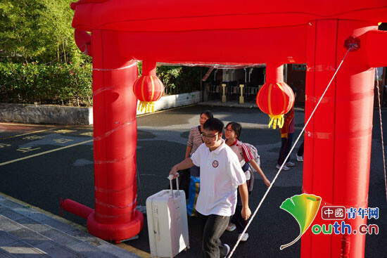 研支团成员带领入校学生走过迎新拱门。贵州大学研支团供图