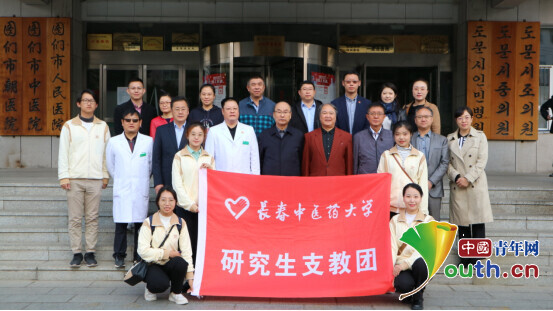 长春中医药大学研究生支教团联合图们市团市委、图们市卫生健康局开展“脱贫攻坚创小康中医义诊送健康”义诊活动。图为长春中医药大学领导专家与研究生支教团合影。岳盼盼 供图