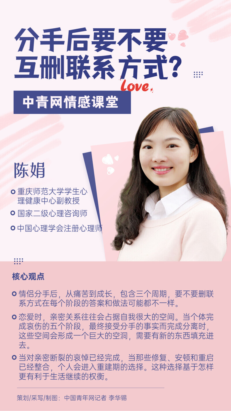重庆师范大学学生心理健康教育与咨询中心副教授、硕士生导师、国家二级心理咨询师、中国心理学会注册心理师陈娟表示,情侣分手后,从痛苦到成长,包含三个周期,要不要删联系方式在每个阶段的答案和做法可能都不一样。