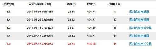 根据中国地震台网记录,6月17日22时55分,四川省宜宾市长宁县发生6.0级地震后,不到1小时,附近的珙县就在当晚23时36分发生5.1级地震;6月18日早上7时34分,长宁县又发生5.3级地震;6月22日22时29分,四川宜宾市珙县发生5.4级地震。