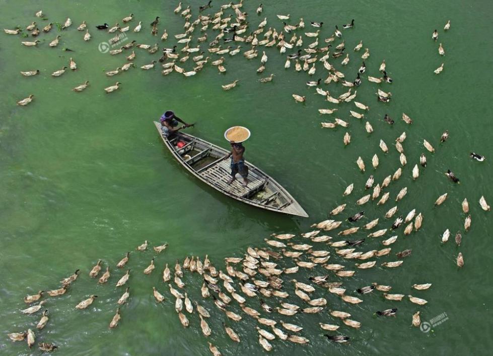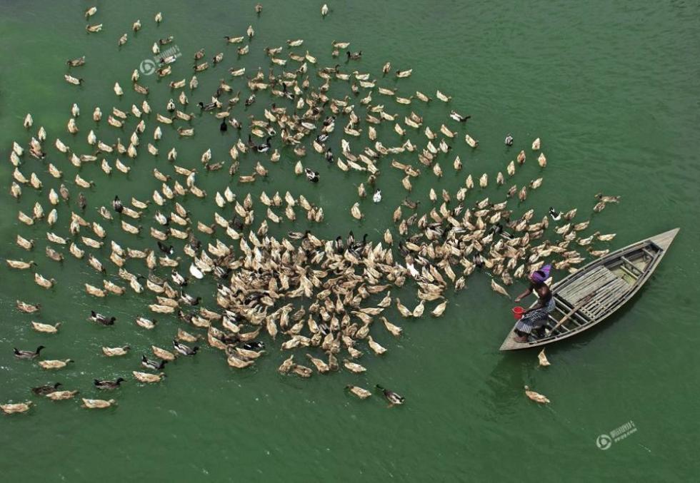 8月23日消息,在孟加拉国Dhunat Upazila,100多只家养的鸭子在当地Karatoa河上围绕着农夫的小船,等待农夫喂食。